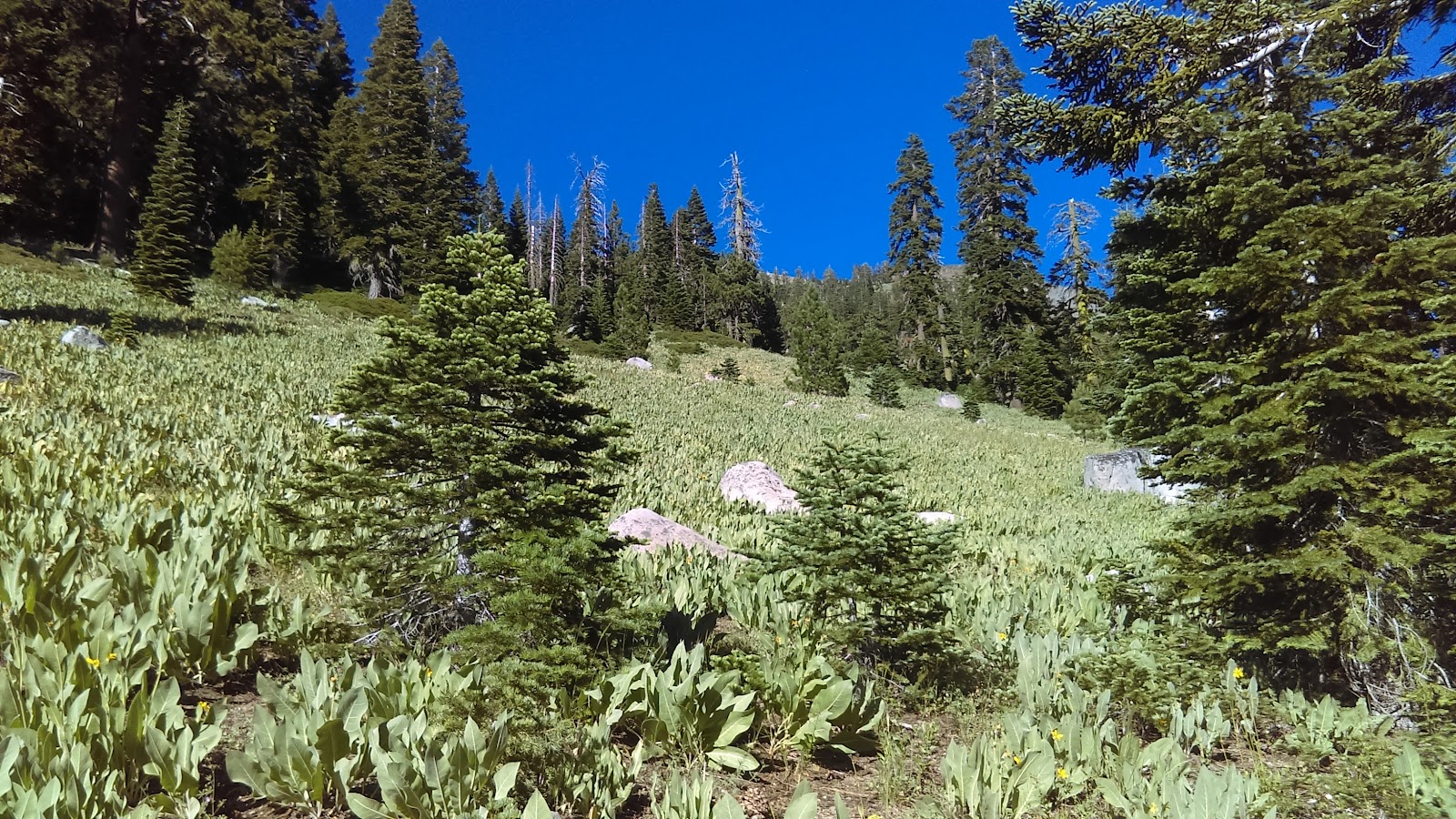 Then it goes up again; But for some reason the 1500 feet elevation gain feels very light. And as I climb higher there is more light, iluminating the rocks, pines and mules ears plants on the slopes. In the meadows is the source of the American River that flows into California's capital city of Sacramento.